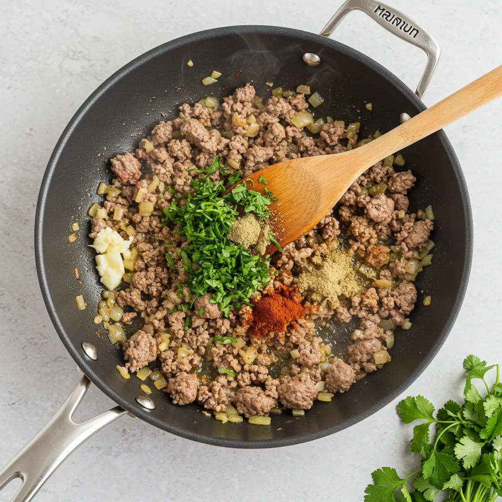 - Add all your spices (cumin, paprika, coriander, salt, pepper, cinnamon)