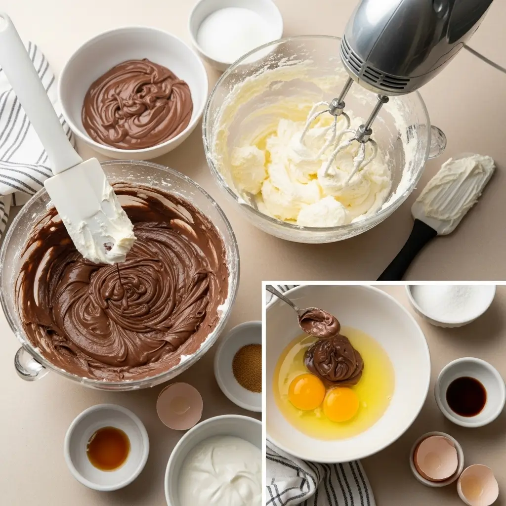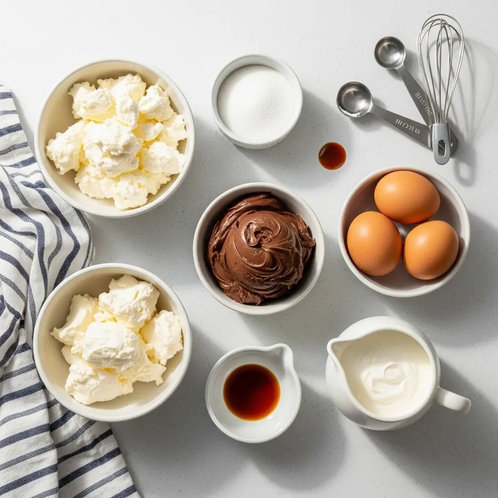 The cream cheese needs to be soft, like butter you can easily spread. Leave it out on the counter for about an hour before starting. Nutella is the star of the show, giving your cheesecake that amazing chocolate-hazelnut flavor. The eggs help everything stick together, and the vanilla makes it smell wonderful.