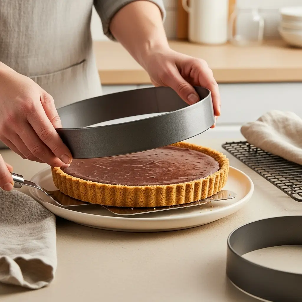 If you used a tart pan with a removable bottom, place the pan on top of a can or sturdy glass. Gently push down on the outer ring, and it will slide down. Slide a thin spatula under the crust to move it to your serving plate.